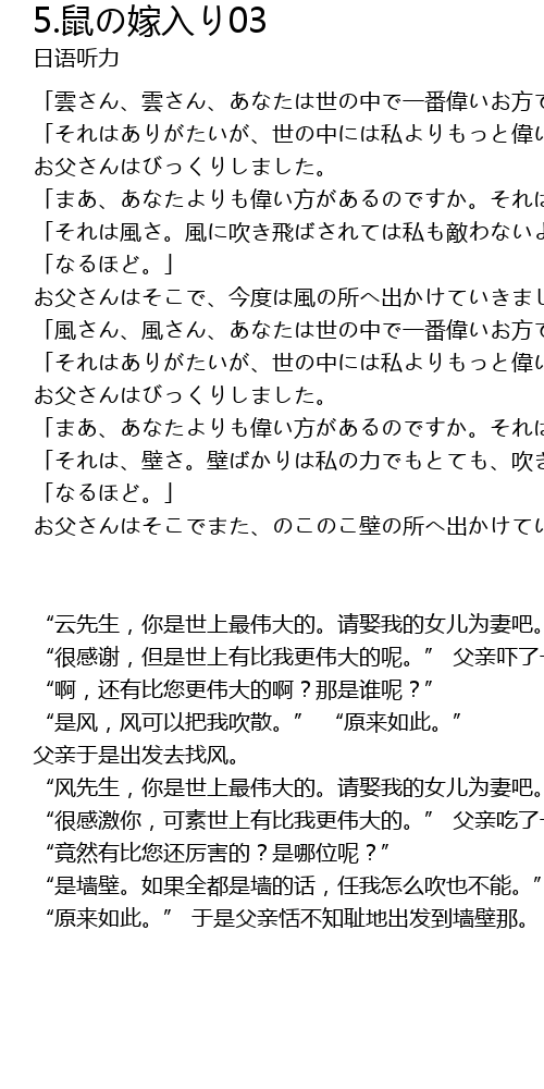 | " yún xiān shēng, nǐ shì shì shàng zuì wěi dà de. qǐng qǔ wǒ de nǚ ér wèi qī ba." " hěn gǎn xiè, dàn shì shì shàng yǒu bǐ wǒ gèng wěi dà de ne." fù qīn xià le yī tiào. " a, hái yǒu bǐ nín gèng wěi dà de a? nà shi shuí ne?" " shì fēng, fēng kě yǐ bǎ wǒ chuī sàn." " yuán lái rú cǐ." fù qīn yú shì chū fā qù zhǎo fēng. " fēng xiān shēng, nǐ shì shì shàng zuì wěi dà de. qǐng qǔ wǒ de nǚ ér wèi qī ba." " hěn gǎn jī nǐ, kě sù shì shàng yǒu bǐ wǒ gèng wěi dà de." fù qīn chī le yī jīng. " jìng rán yǒu bǐ nín hái lì hài de? shì nǎ wèi ne?" " shì qiáng bì. rú guǒ quán dōu shì qiáng de huà, rèn wǒ zěn me chuī yě bù néng." " yuán lái rú cǐ." yú shì fù qīn tián bù zhī chǐ dì chū fā dào qiáng bì nà. |