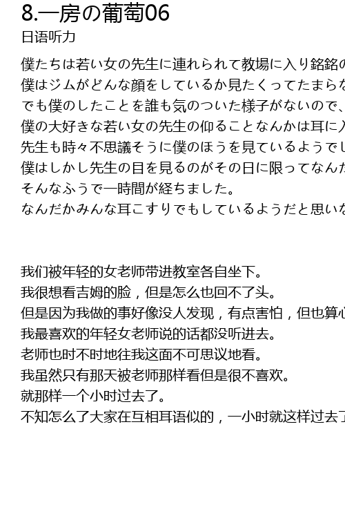 | 我们被年轻的女老师带进教室各自坐下。 我很想看吉姆的脸,但是怎么也回不了头。 但是因为我做的事好像没人发现,有点害怕,但也算心安。 我最喜欢的年轻女老师说的话都没听进去。 老师也时不时地往我这面不可思议地看。 我虽然只有那天被老师那样看但是很不喜欢。 就那样一个小时过去了。 不知怎么了大家在互相耳语似的,一小时就这样过去了。 |