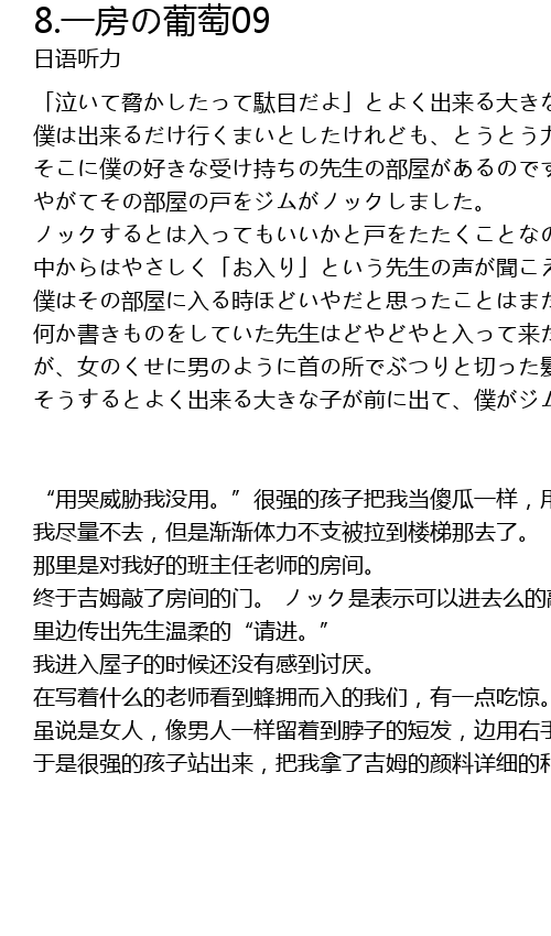 | “用哭威胁我没用。”很强的孩子把我当傻瓜一样,用憎恨的声音说,我本打算不动的,大家靠近我把我强拉到二楼。 我尽量不去,但是渐渐体力不支被拉到楼梯那去了。 那里是对我好的班主任老师的房间。 终于吉姆敲了房间的门。 ノック是表示可以进去么的敲门。 里边传出先生温柔的“请进。” 我进入屋子的时候还没有感到讨厌。 在写着什么的老师看到蜂拥而入的我们,有一点吃惊。 虽说是女人,像男人一样留着到脖子的短发,边用右手拢着,和往常一样温柔的看着这边,歪着脖子像在说你们有什么事。 于是很强的孩子站出来,把我拿了吉姆的颜料详细的和老师说了。 |