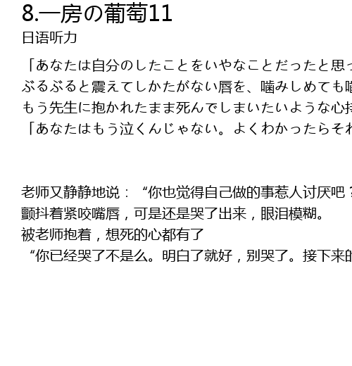 | 老师又静静地说:“你也觉得自己做的事惹人讨厌吧?”,我再也受不了了。 颤抖着紧咬嘴唇,可是还是哭了出来,眼泪模糊。 被老师抱着,想死的心都有了 “你已经哭了不是么。明白了就好,别哭了。接下来的时间不去教室也可以,呆在我的房间吧。安静地呆着。我回来之前在这呆着哈。”说着,让我坐在长椅上,那时又敲了上课铃,给我拿了桌子上的书,在我的方向能看到的爬上二楼的窗子高度的葡萄蔓,摘下了一串外国葡萄,房子还在苦的我的膝盖上,静静地离开了屋子。 |
