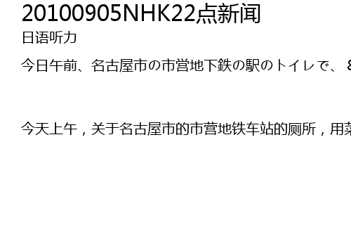 | 今天上午,关于名古屋市的市营地铁车站的厕所,用菜刀杀害81岁的女性的23的女子于今晚被警察逮捕。根据警察的信息显示,此女子面对警察的问话,说着让人摸不到边际的话。今天上午8点前,在名古屋市的市营地铁车站的厕所,名古屋市港区的奥田敏(81岁)的女性,突然遭到一名女子用菜刀砍杀。根据警察的信息显示,奥田从厕所出来,意图通过通道逃跑中,被追杀上来的女子砍伤肩膀、头部等部位,不久后便死亡了。杀害奥田的女子在车站的… |