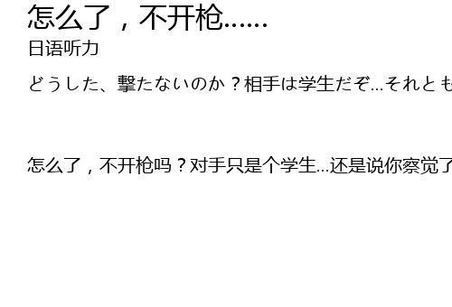 | 怎么了,不开枪吗?对手只是个学生...还是说你察觉了?能开枪的,只有有被射杀觉悟的人。 |