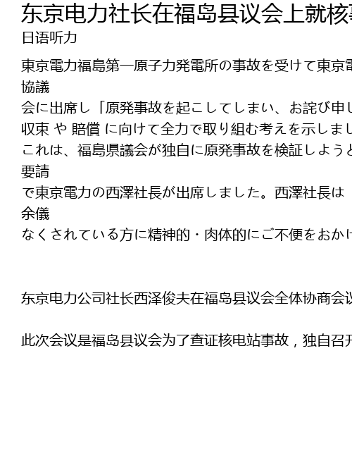 | 此次会议是福岛县议会为了查证核电站事故,独自召开,并要求东电社长西泽俊夫出席。西泽俊夫表示:由于重大的核电站事故,给不得已要避难生活的人,造成的精神上和肉体上的痛苦深感抱歉。 |