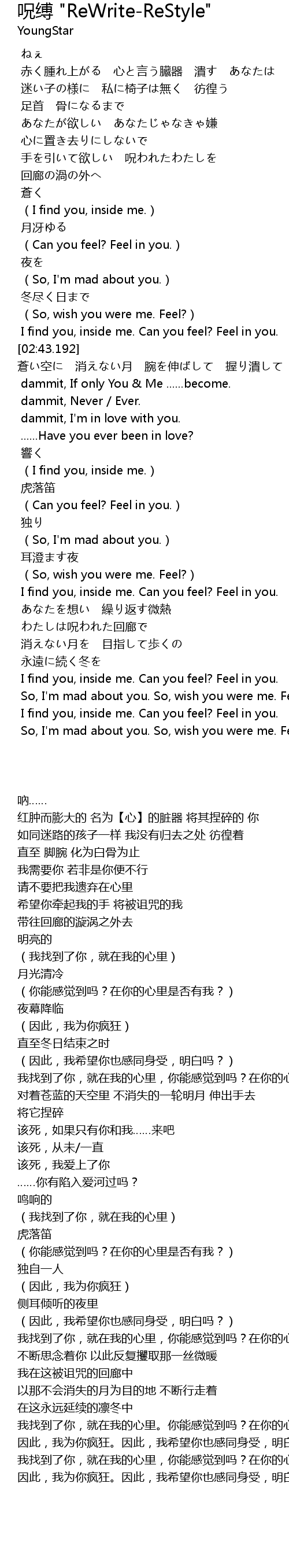 | [02:13.452] | I find you, inside me. Can you feel? Feel in you. |