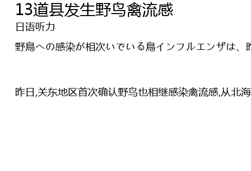 | yě niǎo gǎn rǎn xiāng cì niǎo zuó rì chū guān dōng dì fāng què rèn běi hǎi dào jiǔ zhōu 13 dào xiàn guǎng fēn. huán jìng shěng dōng yě niǎo gǎn rǎn què rèn niǎo qù nián 10 yuè běi hǎi dào dú xìng qiáng 5 1 xíng hán fèn jiàn yǐ jiàng xiāng cì zuó rì guān dōng dì fāng shǐ yǔ dōu gōng shì 1 yǔ gǎn rǎn què rèn běi hǎi dào jiǔ zhōu 13 dào xiàn guǎng. dú xìng qiáng gǎn rǎn què rèn yě niǎo shù dōng 37 yǔ zuì duō. gōng qí lù ér dǎo gè dì yǎng jī chǎng gǎn rǎn xiāng cì zhuān mén jiā dù niǎo yùn xiǎo dòng wù jiè gǎn rǎn kě néng xìng gāo. huán jìng shěng dù niǎo yí dòng chūn xiān jiān shì qiáng huà dōu dào fǔ xiàn hū. | |