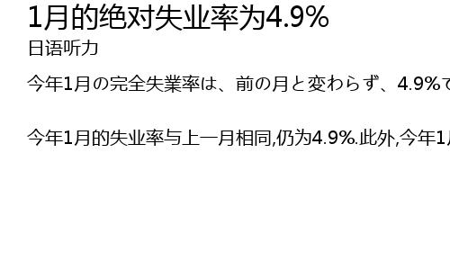 | jin nian 1 yue de shi ye lv yu shang yi yue xiang tong, reng wei 4. 9. ci wai, jin nian 1 yue ri ben de you xiao gu yong bi lv jiao shang yi ge yue shang sheng le 0. 03 ge bai fen dian, shang zhang wei 0. 61 bei. zong wu sheng diao cha jie guo biao ming, jin nian 1 yue de jiu ye ren yuan wei 6204 wan ren, jiao qu nian tong qi jian shao 9 wan ren, jue dui shi ye ren yuan wei 309 wan ren, jiao qu nian tong qi jian shao 14 wan ren. zhe yi jie guo chu qu ji jie yin su ying xiang, ji suan de chu jue dui shi ye lv wei 4. 9 yu shang yue shu zhi chi ping. ci wai, ju hou sheng lao dong sheng biao ming, xiang dui 1 ren de qiu zhi zhe qi ye jiang zhao shou duo shao ren zhe yi you xiao gu yong bi lv, jiao shang yue shang sheng 0. 03 ge bai fen dian, shang zhang wei 0. 61 bei. you xiao gu yong bi lv zhi jin wei zhi, yi lian xu 9 ge yue zhu jian gai shan, zheng shi yuan gong de you xiao gu yong bi lv ye jiao shang ge yue shang zhang 0. 02 ge bai fen dian, shang zhang wei 0. 4 bei. |