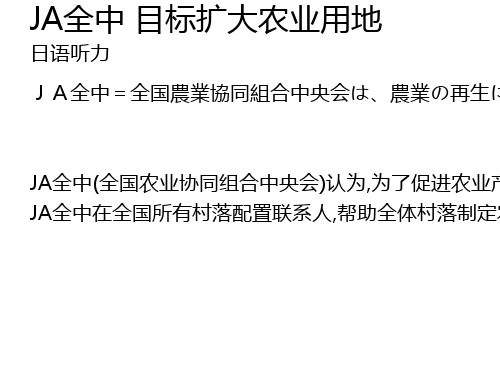 | JA quán zhōng quán guó nóng yè xié tóng zǔ hé zhōng yāng huì rèn wéi, wèi le cù jìn nóng yè chǎn yè fā zhǎn, cǎi qǔ yī xì liè cuò shī. JA quán zhōng yǐ zài jīn hòu 5 nián nèi, jiāng 1 hù nóng mín huò nóng yè shēng chǎn fǎ rén de gēng dì miàn jī kuò dà dào mù qián de 10 bèi yǐ shàng wèi mù biāo. mù qián quán píng jūn 1 hù nóng hù huò nóng yè shēng chǎn fǎ rén de gēng dì miàn jī wèi 2. 2 gōng qǐng, zài jīn hòu 5 nián jiān mù biāo kuò dà wéi 20 gōng qǐng dào 30 gōng qǐng. wèi dá chéng zhè yī mù biāo, JA quán zhōng zài quán guó suǒ yǒu cūn luò pèi zhì lián xì rén, bāng zhù quán tǐ cūn luò zhì dìng nóng yè jīng yíng jì huà, bìng chéng dān jiè dài nóng yè yòng dì de zhōng jiè gōng zuò, yǐ zhī chí nóng hù hé fǎ rén de nóng yè yòng dì jí yuē huà gōng zuò. |