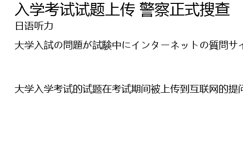 | 大学入学考试的试题在考试期间被上传到互联网的提问网站上,对此,京都府警察本部和警视厅要求运营网站的雅虎公司提交上传纪录.展开正式调查.京都府警察本部和警视厅接受四所大学提交的受害申诉书,像运营网站的雅虎公司要求提交上来有关上传入学考试试题的"IP代码",由此展开正式调查.京都府警察本部和警视厅今后还将请求移动电话公司的协助,紧急调查上传试题所使用的手机的终端特定讯息,从而调查手机用户的情况. |