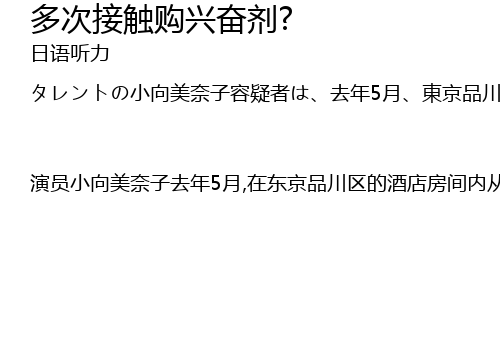 | 演员小向美奈子去年5月,在东京品川区的酒店房间内从贩毒团伙的日本男子手中已4万日圆买入0.9克兴奋剂,违反了兴奋剂取缔法.昨夜从菲律宾回过后即被警察厅逮捕.警察厅去年10月逮捕并搜查了东京都内销售兴奋剂的伊朗人和日本人的贩毒团伙.根据警察厅的调查,嫌犯小向美奈子曾用电话联络毒贩团伙的头目伊朗男子和销售毒品的日本男子,并在东京都内酒店等地多次接触,购买兴奋剂. |