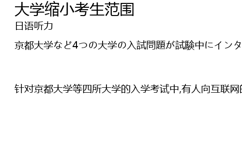 | 针对京都大学等四所大学的入学考试中,有人向互联网的提问网站上传试题的问题,大学方面讨论,对照四所大学的考试名单找出共同的考生,以缩小参与非法行为的考生可能存在的范围,并向警方请求协助等对策.京都大学和同志社大学,以及早稻田大学和立教大学的入学考试的一部分试题,在考试期间被同一网名的人士上传至互联网的”雅虎知识袋”这一提问网站中,并寻求解答,有人给出答案.四所大学在昨天向警方报案,并且各自展开调查.其中京都大学与早稻田大学,对照四所大学的考试名单找出共同的考生,以缩小参与非法行为的考生可能存在的范围. |