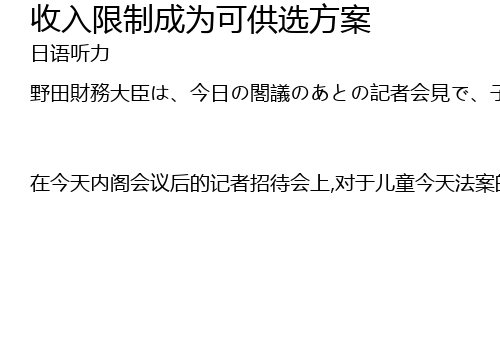 | 在今天内阁会议后的记者招待会上,对于儿童今天法案的修正,民指党的冈田干事长表示会考虑在野党关于引入收入限制的主张.对此,野田财务大臣表示”本来党内也有这样的想法,并不突然”.在野党的主张可能会成为可供选择的方案.在所谓的”扭曲的国会”上,成立儿童津贴法案等相关法案的目标无望实现.民主党的冈田干事长表示,也会在宗和在野党关于引入收入限制的主张. |