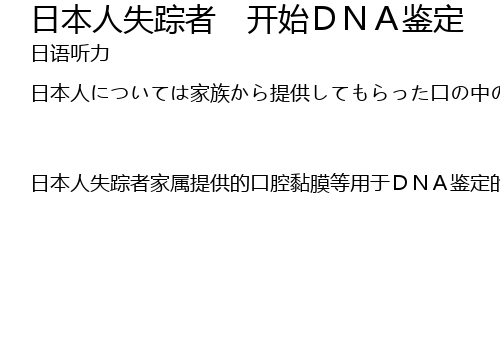 | 日本人失踪者家属提供的口腔黏膜等用于DNA鉴定的资料截至昨天已经全部收齐.当地拥有专业知识的日警察厅职员将对这厢资料进行详细调查,尽早发给新西兰方面,失踪者身分的确认工作从此正式开始. |