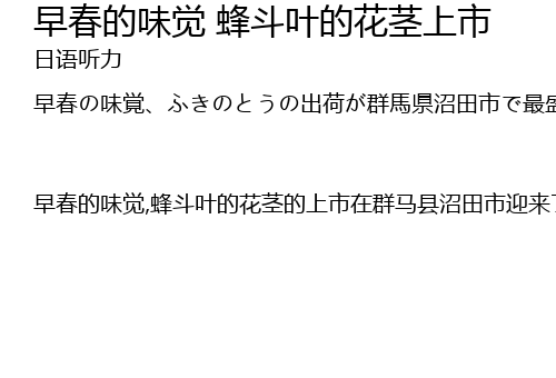 | 早春的味觉,蜂斗叶的花茎的上市在群马县沼田市迎来了高峰期.群马县是全国著名的蜂斗叶花茎的产地,在农用大棚中,农银们用镰刀把蜂斗叶的花茎一棵一棵小心地从根部割下来,然后按大小整理好并包装起来.今年因为受到去年夏季酷暑的影响,根的发育状况不不好,产量与常年相比减少了2成左右.但味道和香味与常年相比并没有变化. |