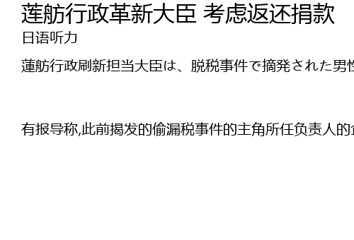 | 有报导称,此前揭发的偷漏税事件的主角所任负责人的企业曾主动向莲舫行政革新大臣担任所代表的政党支部捐款.对此,莲舫行政革新大臣表示,确认确有其事,从道义的角度出发,她考虑返还捐款.有报导称,在平成16年因偷漏税超过3亿日圆的法人税而被逮捕起诉的男子所任负责人的企业,曾于.平成19年6月,向莲舫大臣担任代表的政党支部捐款120万日圆.对此,莲舫大臣于昨晚表明,得知此报导后她展开调查,已确认的确有这项捐款. |