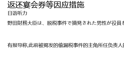 | yǒu bào dǎo chēng, cǐ qián bèi jiē fā de tōu lòu shuì shì jiàn de zhǔ jué suǒ rèn fù zé rén de qǐ yè céng gòu mǎi yě tián shì zhèng zhì zī jīn yàn huì de yàn huì quàn. duì cǐ, yě tián cái wù dà chén biǎo shì, rú guǒ shì shì shí de huà, tā jiāng jìn xíng fǎn huán zī jīn děng yìng duì cuò shī. yǒu bào dǎo chēng, zài píng chéng 16 nián yīn tōu lòu shuì chāo guò 3 yì de fǎ rén shuì ér bèi dài bǔ qǐ sù de nán zǐ suǒ rèn huì cháng de qǐ yè, céng yú píng chéng 19 nián 6 yuè, zài dāng shí rèn zhí mín zhǔ dǎng xuān chuán wěi yuán zhǎng de yě tián cái wù dà chén de zhèng zhì zī jīn yàn huì shàng, gòu mǎi le jià zhí 40 wàn rì yuán de yàn huì quàn. duì cǐ, zài zhòng yì yuàn cái wù jīn róng wěi yuán huì shàng, gōng míng dǎng de zhú nèi ràng yì yuán xiàng yě tián dà chén tí chū zhì wèn. yě tián dà chén chéng rèn zài píng chéng 19 nián 6 yuè céng jǔ xíng yàn huì, bìng biǎo shì" wǒ yě xiǎng què rèn shì fǒu yǒu qí shì. wǒ zuò wéi cái wù dà chén, jiǎ rú tōu lòu shuì de fǎ rén huò gè rén céng gòu mǎi wǒ de yàn huì quàn, hěn bù hé shì. yīn cǐ wǒ huì kǎo lǜ cǎi qǔ fǎn huán zī jīn děng cuò shī." |