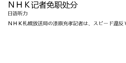 | NHK札幌放送局の漆原充孝記者は、スピード違反で運転免許が取り消されていたにもかかわらず、おととし9月から今年1月末までの1年5ヵ月にわたり、担当していた千歳報道室の業務用の車を運転していました。また、去年6月から9月にかけて、この車の車検が切れたまま運転していました。NHKは、この記者を今月28日付けで懲戒免職処分にすると共に、上司二人をけん責処分にしました。また、NHKが視聴率提供会社の「ビデオリサーチ」から有償で提供を受けている視聴率のデータを今月初までの2年余りにわたり、インターネットの掲示板に不正に投稿していたNHK大津放送局の27歳の男のディレクターについて、今月28日付けで諭旨免職処分にすることにしました。NHKは、「視聴者並びに関係者の皆さまにおわび申し上げます。再発防止に向けて職員への指導を徹底してまいります」としています。 |