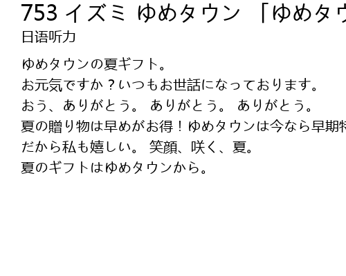 | ゆめタウンの夏ギフト。 お元気ですか?いつもお世話になっております。 おう、ありがとう。 ありがとう。 ありがとう。 夏の贈り物は早めがお得!ゆめタウンは今なら早期特典でゆめカード10倍。 だから私も嬉しい。 笑顔、咲く、夏。 夏のギフトはゆめタウンから。 |
