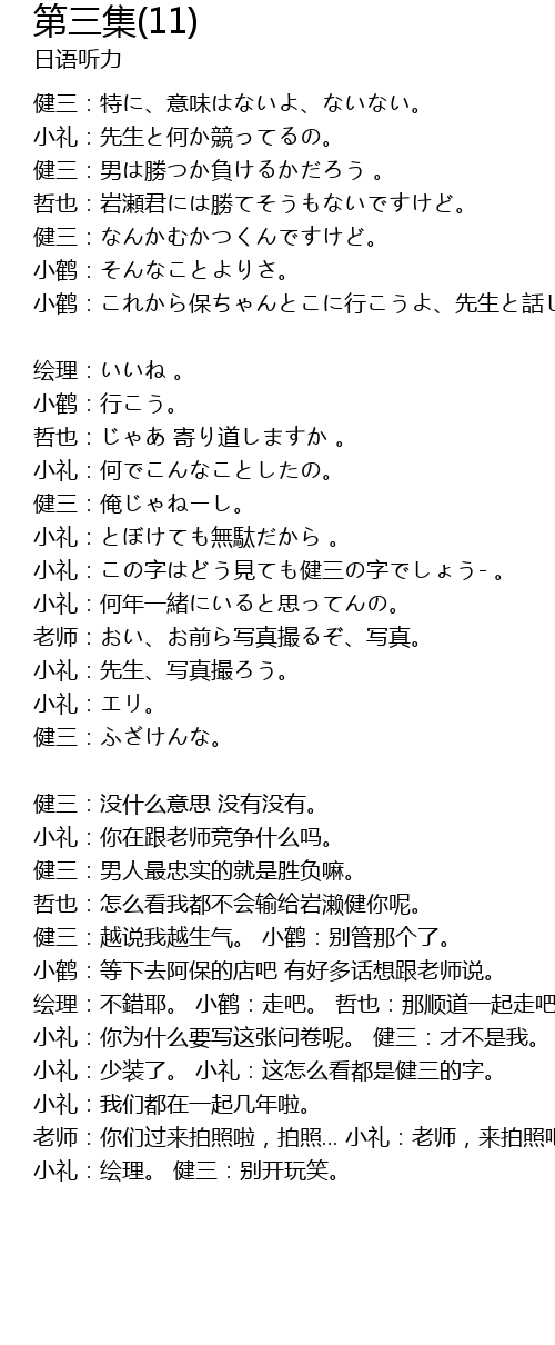 | 健三:没什么意思 没有没有。 小礼:你在跟老师竞争什么吗。 健三:男人最忠实的就是胜负嘛。 哲也:怎么看我都不会输给岩濑健你呢。 健三:越说我越生气。 小鹤:别管那个了。 小鹤:等下去阿保的店吧 有好多话想跟老师说。 绘理:不錯耶。 小鹤:走吧。 哲也:那顺道一起走吧。 小礼:你为什么要写这张问卷呢。 健三:才不是我。 小礼:少装了。 小礼:这怎么看都是健三的字。 小礼:我们都在一起几年啦。 老师:你们过来拍照啦,拍照... 小礼:老师,来拍照吧。 小礼:绘理。 健三:别开玩笑。 |