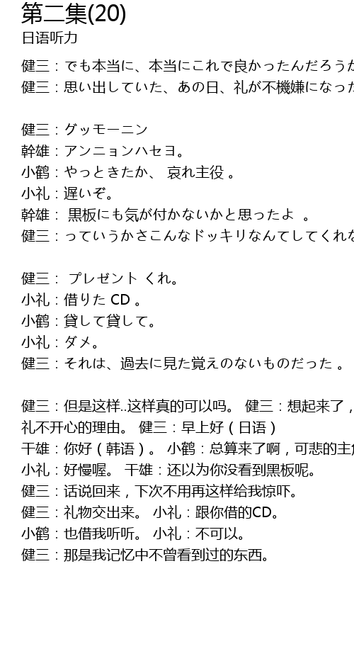| 健三:但是这样..这样真的可以吗。 健三:想起来了,那天 礼不开心的理由。 健三:早上好(日语) 干雄:你好(韩语)。 小鹤:总算来了啊,可悲的主角。 小礼:好慢喔。 干雄:还以为你没看到黑板呢。 健三:话说回来,下次不用再这样给我惊吓。 健三:礼物交出来。 小礼:跟你借的CD。 小鹤:也借我听听。 小礼:不可以。 健三:那是我记忆中不曾看到过的东西。 |