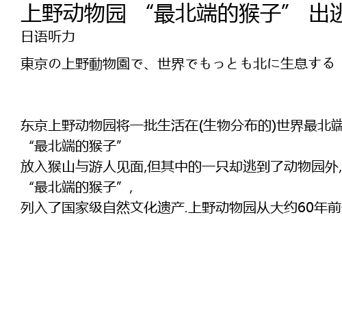 | dōng jīng shàng yě dòng wù yuán jiāng yī pī shēng huó zài shēng wù fēn bù de shì jiè zuì běi duān dì " zuì běi duān dì hóu zi" fàng rù hóu shān yǔ yóu rén jiàn miàn, dàn qí zhōng de yì zhī què táo dào le dòng wù yuán wài, zhì jīn xià luò bù míng. yuán fāng zài yuán nèi shè zhì fàng yǒu shí wù de lóng zi, shí shī yòu bǔ. gāng gāng kāi shǐ yǔ yóu rén jiàn miàn dí zhèi xiē hóu zi, shì shēng huó zài qīng sēn xiàn xià běi bàn dǎo de rì běn mí hóu. tā men bèi chēng wéi " zuì běi duān dì hóu zi", liè rù le guó jiā jí zì rán wén huà yí chǎn. shàng yě dòng wù yuán cóng dà yuē 60 nián qián kāi shǐ, duì yuán nèi de rì běn mí hóu jìn xíng le duō cì jiāo pèi, dàn yǐn rù qí tā dì qū de hóu zi zhè hái shì dì yī cì. ér jiù zài jīn tiān jiàng lái zì xià běi bàn dǎo de 23 zhǐ hóu zi fàng rù hóu shān hòu, què yǒu yì zhī táo pǎo le. suī rán hóu shān zhōu wéi shè yǒu sì mǐ gāo de wéi qiáng, dàn hóu zi hái shì nòng duàn le wéi qiáng shàng de gōng shuǐ guǎn táo chū, zài yuán nèi zhuǎn le jǐ quān hòu biàn pǎo dào le yuán wài, qù xiàng bù míng. yóu yú yǒu rén chēng zài shàng yě gōng yuán nèi kàn dào guò zhè zhǐ hóu zi, suǒ yǐ dòng wù yuán fāng miàn zài ān pái rén yuán xún shì de tóng shí, yī kào fàng yǒu shí wù de lóng zǐ shí shī yòu bǔ. |