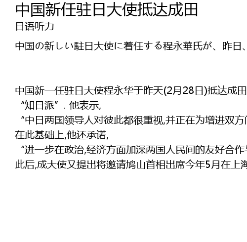 | zhōng guó xīn yī rèn zhù rì dà shǐ chéng yǒng huá yú zuó tiān 2 yuè 28 rì dǐ dá chéng tián jī chǎng, biǎo shì xī wàng tōng guò zì jǐ de nǔ lì jìn yī bù jiā shēn zhōng rì jiān de hé zuò guān xì. zuó tiān 2 yuè 28 rì, jiē tì xiàn rèn zhōng guó wài jiāo bù fù bù zhǎng cuī tiān kǎi dān rèn zhù rì dà shǐ de chéng yǒng huá dǐ dá chéng tián jī chǎng. xiàn nián 55 suì de chéng dà shǐ jù yǒu duō nián zài rì běn gōng zuò jīng yàn, shì yī wèi zhù míng de " zhī rì pài". tā biǎo shì, " zhōng rì liǎng guó lǐng dǎo rén duì bǐ cǐ dōu hěn zhòng shì, bìng zhèng zài wèi zēng jìn shuāng fāng jiān hé zuò ér nǔ lì". zài cǐ jī chǔ shàng, tā hái chéng nuò, " jìn yī bù zài zhèng zhì, jīng jì fāng miàn jiā shēn liǎng guó rén mín jiān de yǒu hǎo hé zuò yǔ zhàn lüè xìng hù huì guān xì". cǐ hòu, chéng dà shǐ yòu tí chū jiāng yāo qǐng jiū shān shǒu xiàng chū xí jīn nián 5 yuè zài shàng hǎi kāi mù de shì bó huì, bìng xī wàng jí cǐ jī huì cù jìn zhōng rì shǒu nǎo jiān de jiāo liú. |