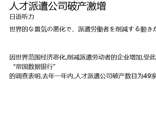 | 因世界范围经济恶化,削减派遣劳动者的企业增加,受此影响,去年好多人才派遣公司相继破产,据悉,破产数目是5年前因允许向生产制造业派遣劳动者而导致破产数目的3倍.根据民间信用调查公司 “帝国数据银行” 的调查表明,去年一年内,人才派遣公司破产数目为49家,比前一年增加了16家,是5年前因允许向生产制造业派遣劳动者而导致破产的数目的3被.人才派遣公司破产数目激增,自5年前解禁以来,汽车和电机等制造厂家大量接收派遣劳动者,在世界范围的经济恶化情况下,企业业绩急落谷底,因而大规模裁员是其主要原因. |