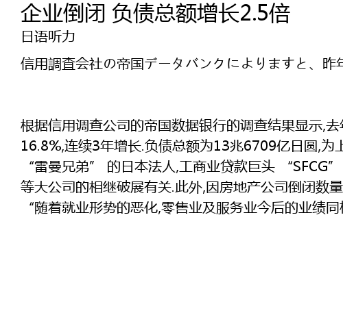 | gēn jù xìn yòng diào chá gōng sī de dì guó shù jù yín háng de diào chá jié guǒ xiǎn shì, qù nián yīn fù zhài jīn é chāo guò 1000 wàn rì yuán ér xiàng fǎ yuàn shēn qǐng pò chǎn de qǐ yè shù liàng dá 13234 jiā, bǐ shàng yī nián zēng jiā 16. 8, lián xù 3 nián zēng zhǎng. fù zhài zǒng é wèi 13 zhào 6709 yì rì yuán, wèi shàng nián dù de 2. 5 bèi, jū zhāo hé 39 nián yǒu shù jù tǒng jì yǐ lái de dì 5 wèi. zhè yǔ shòu jīn róng wēi jī yǐng xiǎng de měi guó dà xíng zhèng quàn gōng sī " léi màn xiōng dì" de rì běn fǎ rén, gōng shāng yè dài kuǎn jù tóu " SFCG" děng dà gōng sī de xiāng jì pò zhǎn yǒu guān. cǐ wài, yīn fáng dì chǎn gōng sī dǎo bì shù liàng zēng jiā, fù zhài jīn é gāo dá 100 yì rì yuán yǐ shàng de àn lì yuē wèi shàng yī nián dù de liǎng bèi. gāi xìn yòng gōng sī chēng, " suí zhe jiù yè xíng shì de è huà, líng shòu yè jí fú wù yè jīn hòu de yè jī tóng yàng lìng rén dān yōu, pò chǎn shàng shēng shì tóu mù qián hái bú huì huǎn jiě". |