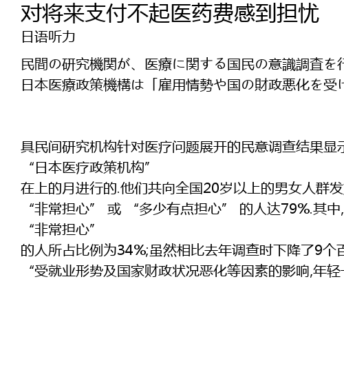 | ju min jian yan jiu ji gou zhen dui yi liao wen ti zhan kai de min yi diao cha jie guo xian shi, you jin 80 de ren dui jiang lai huan zhong bing shi shi fou hui fu dan bu qi yi liao fei gan dao dan you, nian qing ren de dan xin cheng du you zhong. ben ci diao cha shi min jian diao cha ji gou " ri ben yi liao zheng ce ji gou" zai shang de yue jin xing de. ta men gong xiang quan guo 20 sui yi shang de nan nv ren qun fa fang le 1650 fen diao cha wen juan, hui shou 1024 ren de wen juan, zhan zong bi li de 62. ju diao cha jie guo xian shi, dang bei wen ji shi fou hui dui jiang lai huan zhong bing shi fu dan bu qi yi yao fei gan dao dan xin shi, hui da " fei chang dan xin" huo " duo shao you dian dan xin" de ren da 79. qi zhong, hui da " fei chang dan xin" de ren suo zhan bi li wei 34 sui ran xiang bi qu nian diao cha shi xia jiang le 9 ge bai fen dian, dan cong nian ling ceng shang kan, nian qing ren suo zhan bi li you suo zeng gao, 20 sui ren qun wei 42, 30 sui ren qun 44. dui yu ci ci diao cha jie guo, ri ben yi liao zheng ce ji gou ren wei: " shou jiu ye xing shi ji guo jia cai zheng zhuang kuang e hua deng yin su de ying xiang, nian qing yi dai pu bian dui wei lai shou ru, yi liao fei zi ji fu dan bu fen zeng jia deng chi bu le guan tai du." |