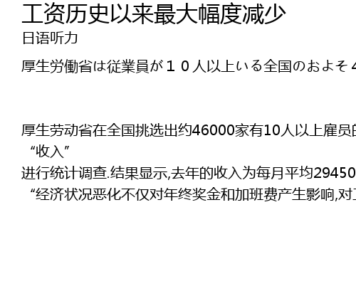 | hòu shēng láo dòng shěng zài quán guó tiāo xuǎn chū yuē 46000 jiā yǒu 10 rén yǐ shàng gù yuán de shì wù suǒ, duì yuè gōng zī kòu chú jiā bān fèi děng xiàng mù hòu de " shōu rù" jìn xíng tǒng jì diào chá. jié guǒ xiǎn shì, qù nián de shōu rù wèi měi yuè píng jūn 294500 rì yuán, bǐ qù nián jiǎn shǎo 1. 5, jí yuè píng jūn jiǎn shǎo 4600 rì yuán shōu rù. bǐ jiào zhèng shì yuán gōng hé fēi zhèng shì yuán gōng, zhèng shì yuán gōng yuè píng jūn gōng zī 310400 rì yuán, jiǎn shǎo 1. 9, fēi zhèng shì yuán gōng yuè píng jūn gōng zī 194600 rì yuán, jiǎn shǎo 0. 1, zhèng shì yuán gōng gōng zī xià jiàng fú dù jiào dà. zài àn zhào háng yè lèi bié tǒng jì, xià jiàng fú dù zuì dà de shì yùn shū yóu dì háng yè, wèi 255100 rì yuán, jiǎn shǎo 7. 5, qí cì shì pī fā líng shòu shāng háng yè wèi 297000 rì yuán, jiǎn shǎo 3. 1, lǚ guǎn cān yǐn fú wù háng yè wèi 237500 rì yuán, jiǎn shǎo 2. 3, gè háng yè dōu yǒu suǒ jiǎn shǎo. hòu shēng láo dòng shěng fēn xī " jīng jì zhuàng kuàng è huà bù jǐn duì nián zhōng jiǎng jīn hé jiā bān fèi chǎn shēng yǐng xiǎng, duì gōng zī běn shēn yě yǒu hěn dà yǐng xiǎng. |