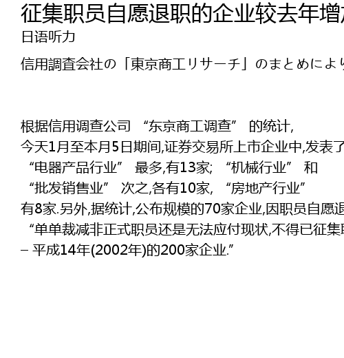 | gēn jù xìn yòng diào chá gōng sī " dōng jīng shāng gōng diào chá" de tǒng jì, jīn tiān 1 yuè zhì běn yuè 5 rì qī jiān, zhèng quàn jiāo yì suǒ shàng shì qǐ yè zhōng, fā biǎo le zhēng jí zhí yuán zì yuàn tuì zhí gōng wén de qǐ yè yǒu 81 jiā, jǐn jǐn liǎng gè duō yuè shí jiān, jiù bǐ qù nián yī nián zhōng yǒu 68 jiā qǐ yè de shù jù yǒu suǒ zēng jiā. cóng háng yè bié lái kàn, " diàn qì chǎn pǐn háng yè" zuì duō, yǒu 13 jiā " jī xiè háng yè" hé " pī fā xiāo shòu yè" cì zhī, gè yǒu 10 jiā, " fáng dì chǎn háng yè" yǒu 8 jiā. lìng wài, jù tǒng jì, gōng bù guī mó de 70 jiā qǐ yè, yīn zhí yuán zì yuàn tuì zhí ér jiǎn shǎo de qǐ yè rén shù chāo guò 6600 rén, yǔ qù nián yī nián shí jiān lǐ dà yuē 7400 rén de shù jù jiē jìn. xìn yòng diào chá gōng sī biǎo shì, " dān dān cái jiǎn fēi zhèng shì zhí yuán hái shì wú fǎ yìng fù xiàn zhuàng, bù dé yǐ zhēng jí zhí yuán zì yuàn tuì zhí de qǐ yè zhèng zài zēng duō. 9 nián qián kāi shǐ diào chá yǐ lái, jīn nián zhēng jí zhí yuán zì yuàn tuì zhí de qǐ yè yǒu kě néng chāo guò qì jīn de zuì gāo jì lù píng chéng 14 nián 2002 nián de 200 jiā qǐ yè." |