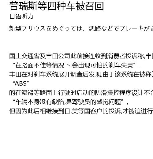 | 国土交通省及丰田公司此前接连收到消费者投诉称,丰田新推出的普瑞斯车 “在路面不佳等情况下,会出现可怕的剎车失灵”. 丰田在对剎车系统展开调查后发现,由于该系统在被称为 “ABS” 的在湿滑等路面上行驶时启动的防滑操控程序设计不合理,导致车辆预测到的停车前制动距离比驾驶员预想的距离要长,确实存在安全隐患.丰田决定,将从明天(10日)开始免费为普瑞斯车型提供安全措施,包括维修系统操控程序,以确保剎车性能等;而其他三款车型的维修工作,将在程序准备完毕后展开.有关此次召回,丰田原本认为: “车辆本身没有缺陷,是驾驶员的感觉问题”, 但因为此后相继接到日,美等国客户的投诉,才被迫进行召回的. |