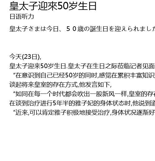 | 今天(23日), 皇太子迎来50岁生日.皇太子在生日之际莅临记者见面会. “在意识到自己已经50岁的同时,感觉在累积丰富知识方面,还必须更加努力.” 谈起将来皇室的存在方式,他发言如下, “如同在每一个时代都会吹出一股新风一样,皇室的存在方式也随着时代变迁而发生变化.我想一边学习历史,一边追求将来的皇室的存在方式.” 在谈到治疗进行5年半的雅子妃的身体状态时,他说到道, “近来,可以肯定雅子积极地接受治疗,身体状况逐渐好转.虽然如此,还是有必要继续接受治疗.我遵照医生的嘱咐,同时支持雅子,(希望她)早日康复.” |
