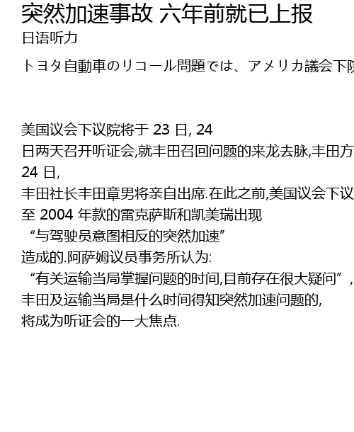 | 美国议会下议院将于 23 日, 24 日两天召开听证会,就丰田召回问题的来龙去脉,丰田方面的应对展开提问. 24 日, 丰田社长丰田章男将亲自出席.在此之前,美国议会下议院议员阿萨姆发现,保险公司早在六年前就已向美国运输当局报告,因丰田车突然加速引发的事故不断增多.他指出,根据得到的数据显示,保险公司曾告诉运输当局,已有三十多起事故都是由于2002 至 2004 年款的雷克萨斯和凯美瑞出现 “与驾驶员意图相反的突然加速” 造成的.阿萨姆议员事务所认为: “有关运输当局掌握问题的时间,目前存在很大疑问”, 因此, 丰田及运输当局是什么时间得知突然加速问题的, 将成为听证会的一大焦点. |