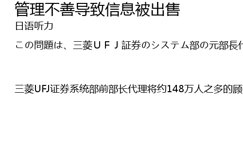 | san ling UFJ zheng quan xi tong bu qian bu zhang dai li jiang yue 148 wan ren zhi duo de gu ke ge ren xin xi fei fa wai dai, bing jiang qi zhong 49000 ren de zhu suo, nian shou ru deng xiang guan xin xi chu shou gei ming dan fan zi. gai qian bu zhang dai li shi shao you de ji wei ke yi fang wen gu ke xin xi de zhi yuan zhi yi, ta zheng shi lan yong le zhe zhong quan xian jiang xin xi cong gong si ji suan ji fu zhi dao CD shang dai chu gong si. zai san ling UFJ zheng quan zhong, yong you gai quan xian de yuan gong gong you 8 ren, dan bing mei you jian li shang ji zai zhi yuan fang wen gu ke xin xi shi jin xing jian guan de ji zhi, cai shi de qian bu zhang dai li jiang xin xi wai dai. er qie, ci shi hai shi zai gu ke dui ci ti chu zhi yi hou, cai bei fa xian de. gong si yi gui ding, jin hou zhi yuan fang wen gu ke xin xi shi bi xu you liang ren tong shi zai chang, jiang shi yong mu di xiang shang ji hui bao hou, you shang ji zhu ci fa fang deng lu mi ma. dan ci ju mei neng bi mian xin xi guan li ti zhi bu shan zao cheng de xin yu xia jiang, gong si xian zheng zai xun qiu gen ben de jie jue fang an. |