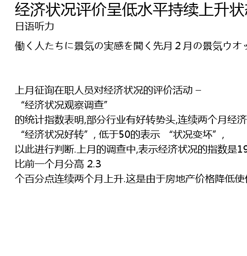 | 上月征询在职人员对经济状况的评价活动 – “经济状况观察调查” 的统计指数表明,部分行业有好转势头,连续两个月经济状况呈上升趋势,但是,整体经济依然停留在低水平状态.本次调查是内阁府以全国的零售商和企业等在职人员2000余人为对象进行征询的,与三个月前的经济状况相比,以指数表示出调查结果.指数高于50的表示 “经济状况好转”, 低于50的表示 “状况变坏”, 以此进行判断.上月的调查中,表示经济状况的指数是19.4, 比前一个月分高 2.3 个百分点连续两个月上升.这是由于房地产价格降低使住宅样板间展示现场签约率提高,因日圆升值使海外旅行业务收入上升等原因,部分航也有好转势头. |