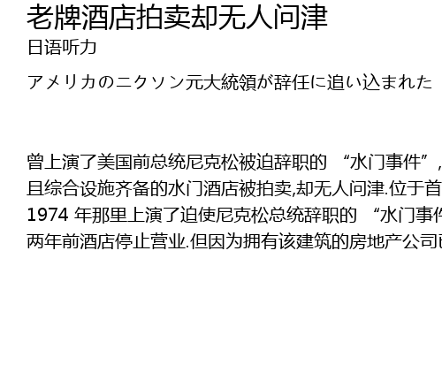 | 曾上演了美国前总统尼克松被迫辞职的 “水门事件”, 且综合设施齐备的水门酒店被拍卖,却无人问津.位于首都华盛顿的水门酒店是一家综合设施齐备的12层高档酒店, 1974 年那里上演了迫使尼克松总统辞职的 “水门事件”. 两年前酒店停止营业.但因为拥有该建筑的房地产公司已破产,所以债权人开始拍卖酒店.虽然所设定的最低竞标价仅为23亿多日圆,大大低于债权额,但依旧流拍,没有出现买家.今后,债权人一方将计划在房地产市场寻找买家,但这家被载入美国历史的老牌酒店确实无可避免地陷入了严峻的经济危机狂潮中. |