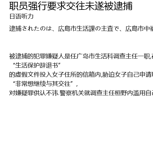 | 被逮捕的犯罪嫌疑人是任广岛市生活科调查主任一职,在广岛市中福利事务所负责援助社会工作的桓野内纪之.根据警方调查,调查主任桓野内涉嫌强行要求交往未遂.调查主任桓野内与自己负责的生活保护辅助人,一位30岁的女子曾经交往过,因去年9月份对方提出分手,他暗示对方停止支付生活补助金等强行要求继续交往.据警方调查,调查主任桓野内将写有 “生活保护辞退书” 的虚假文件投入女子住所的信箱内,胁迫女子自己申请取消生活保护.女子收到文件后向警察机关报告,使事件暴露.面对调查,调查主任桓野内说, “非常想继续与其交往”, 对嫌疑罪供认不讳.警察机关就调查主任桓野内滥用自己援助社会工作的职权强行要求对方继续交往一事展开调查. |