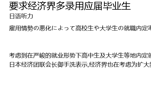 | kao lv dao zai yan jun de jiu ye xing shi xia gao zhong sheng ji da xue sheng deng di nei ding jiu ye bi lv xiang bi qu nian you you da fu xia jiang wen ti, hou sheng lao dong sheng yu wen bu ke xue sheng, hui tong jing ji chan ye sheng de san xing da chen yao qiu ri ben jing ji tuan ti duo lu yong ying jie bi ye sheng. hou sheng lao dong sheng yu wen bu ke xue sheng, hui tong jing ji chan ye sheng de san xing da chen zai dong jing du mou fan dian hui jian le ri ben jing ji tuan lian jing ji tuan ti lian he hui, ri ben shang gong hui yi suo deng si jia jing ji tuan ti de hui chang. qi jian, san ming da chen dui hui chang men ti chu le duo lu yong ding yu lai nian chun tian bi ye de gao zhong sheng he da xue sheng, bu qu xiao yi you nei ding deng yao qiu. hui jian jie shu hou, ri ben jing ji tuan lian hui chang yu shou xi biao shi, jing ji jie ye zai kao lv wei kuo da xin ren lu yong zhong de ying jie sheng bi li er nu li. |