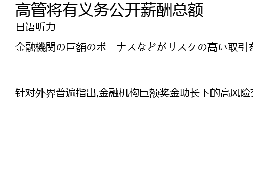 | 针对外界普遍指出,金融机构巨额奖金助长下的高风险交易是导致金融危机的因素之一,金融厅出台政策敦促上市公司有义务公开支付给高管的薪酬总额,提高透明度.虽然进入证券市场的企业原本就有义务向股东公开支付给高管的薪酬总额,但是否对其他人公开,则是由企业自行决定.对此,金融厅认为,薪酬是显示企业经营方针的重要信息.为此,今后将修改内阁府令,要求以公开高管报酬总额的上市企业为主,各企业有义务提交有价证券报告.围绕企业高管报酬,外界普遍指出,金融机构巨额奖金助长下的高风险交易是导致金融危机的因素之一.预计本月在美国匹兹堡召开的世界20国首脑金融高级会议上,限制金融机构的薪酬也将成为议题之一,越来越多的国家正在行动起来提高薪酬透明度. |