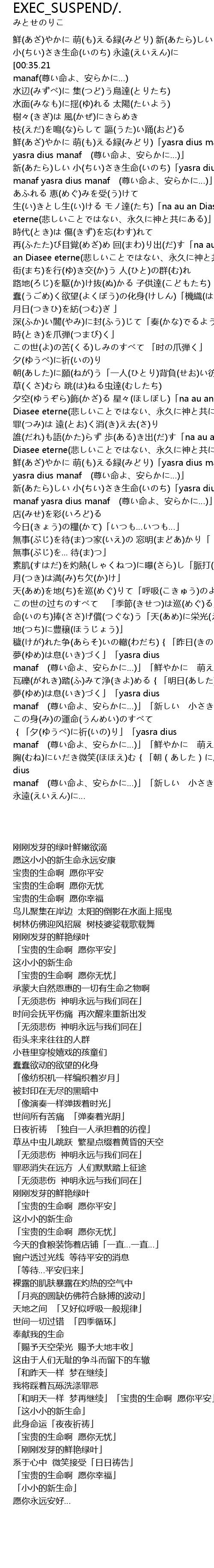 | [00:44.48][00:35.21][00:25.63] | yasra dius manaf yasra dius manaf(尊い命よ、安らかに…) |