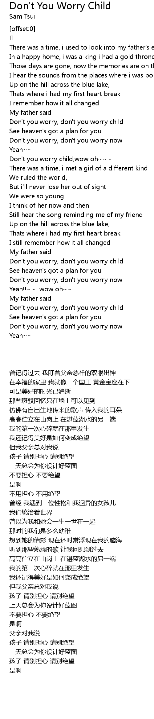 | [01:19.388] | Don't you worry child,wow oh~~~ |