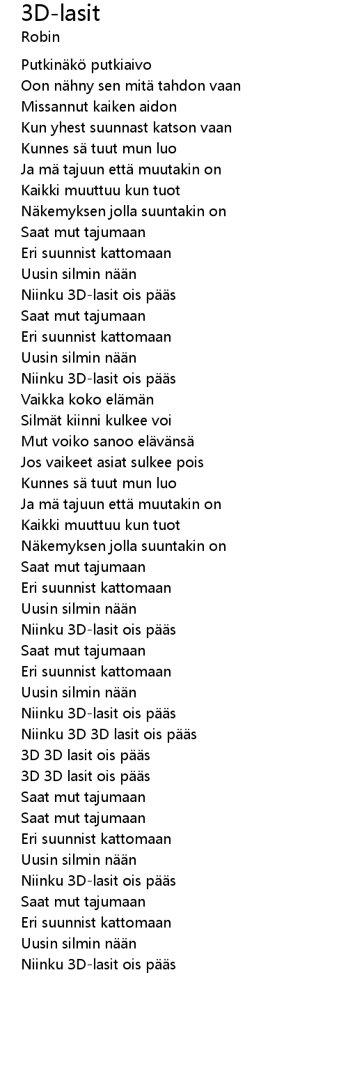 | [02:10.70] | Niinku 3D 3D lasit ois p s |