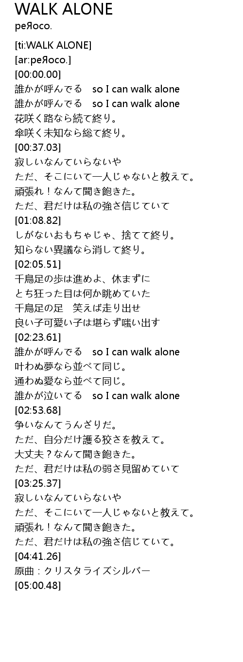 | [02:24.88] | 誰かが呼んでる so I can walk alone |