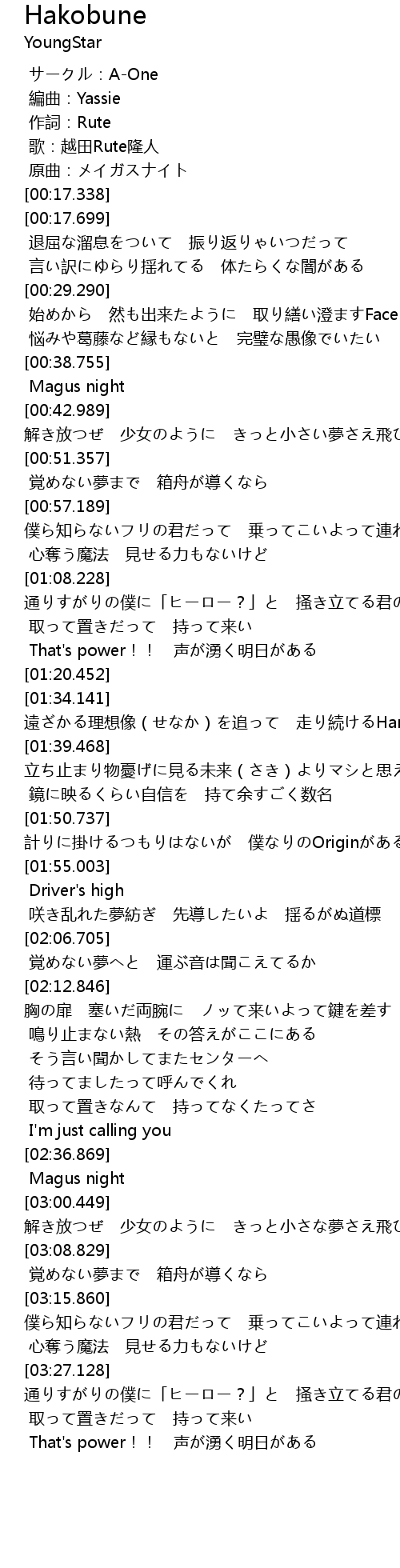 | [03:15.860] | 僕ら知らないフリの君だって 乗ってこいよって連れ出すぜ |