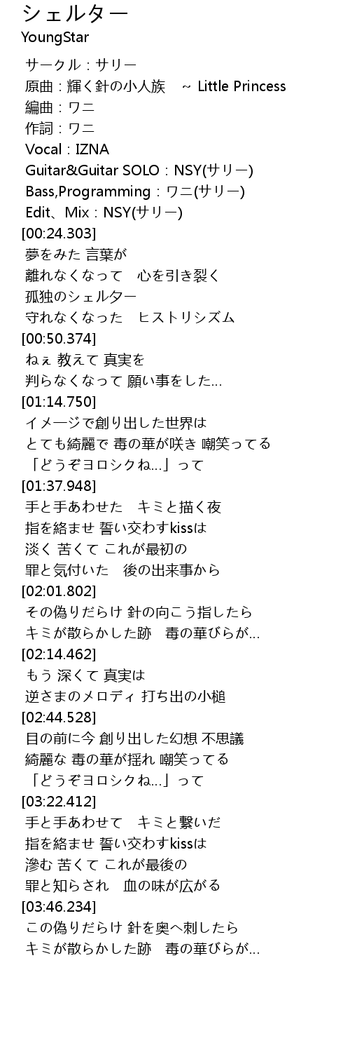 | [03:46.915] | この偽りだらけ 針を奥へ刺したら |