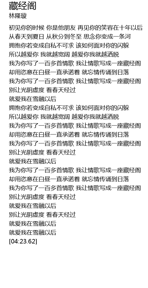 | [03:45.83] | 我为你写了一百多首情歌 我让情歌写成一座藏经阁 |