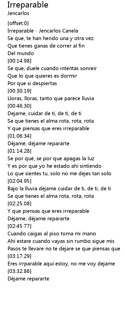 | [00:00.11] | Irreparable - Jencarlos Canela |