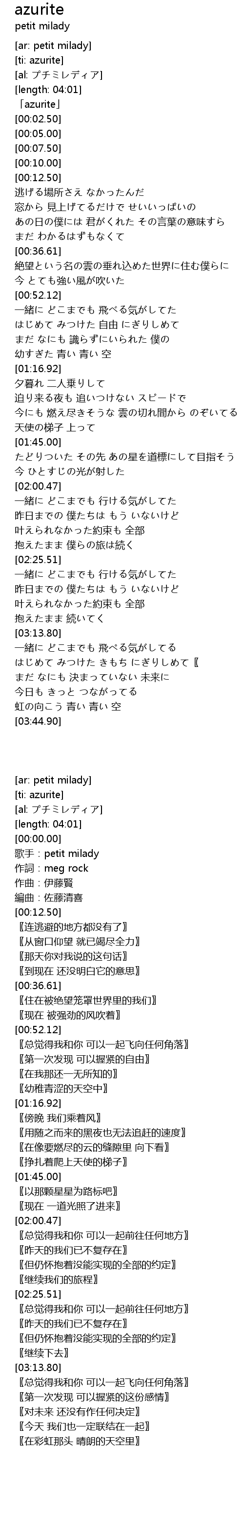 | [03:34.99] | 虹の向こう 青い 青い 空 |