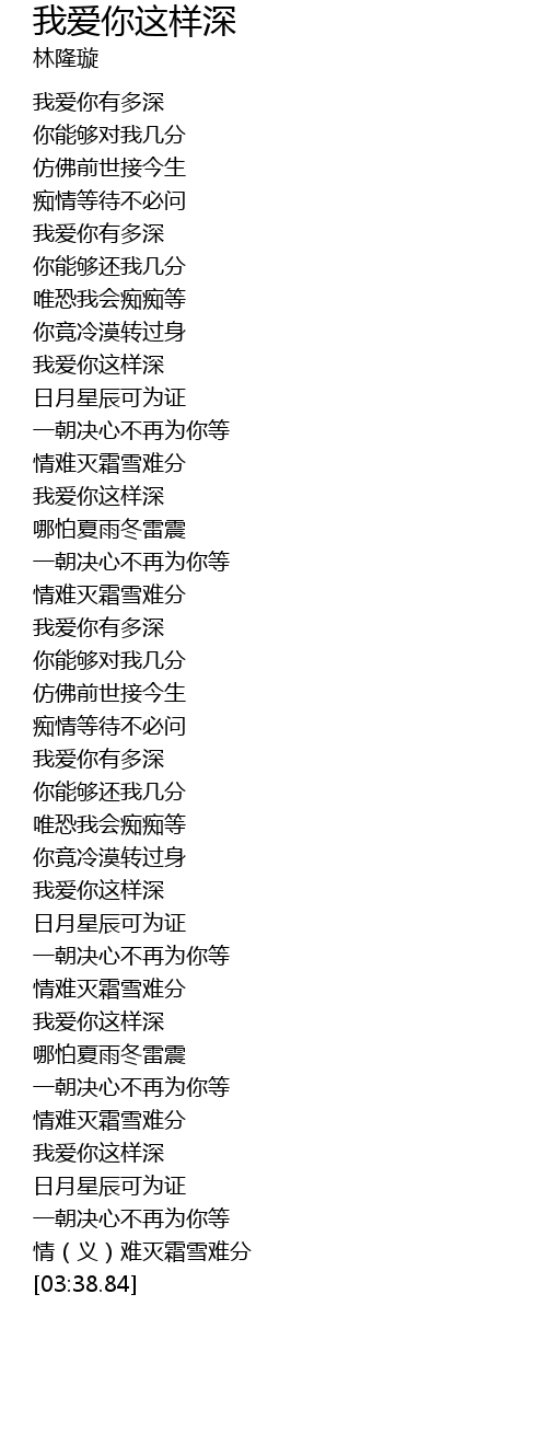 | [01:39.00] | wǒ ài nǐ yǒu duō shēn |