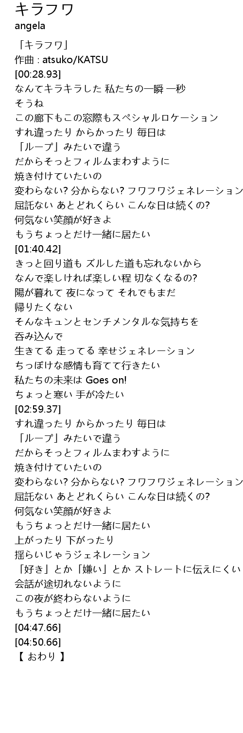 | [01:16.87] | 変わらない? 分からない? フワフワジェネレーション |